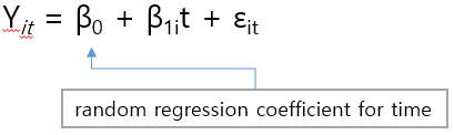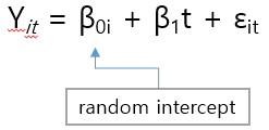 - Random intercept model ( i.e. 각 subject 마가 regression line의 intercept가 다르다(random)는 가정)