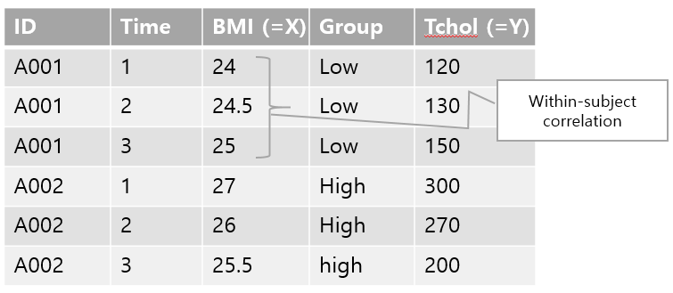 - Clustered Data : 대상자는 서로 iid (independent and identically distribution)이 아니고, 서로 correlated 되어 Cluster를 이루는 데이터