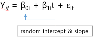 - Random slope model ( i.e. 각 subject 마가 regression line의 slope가 다르다(random)는 가정)